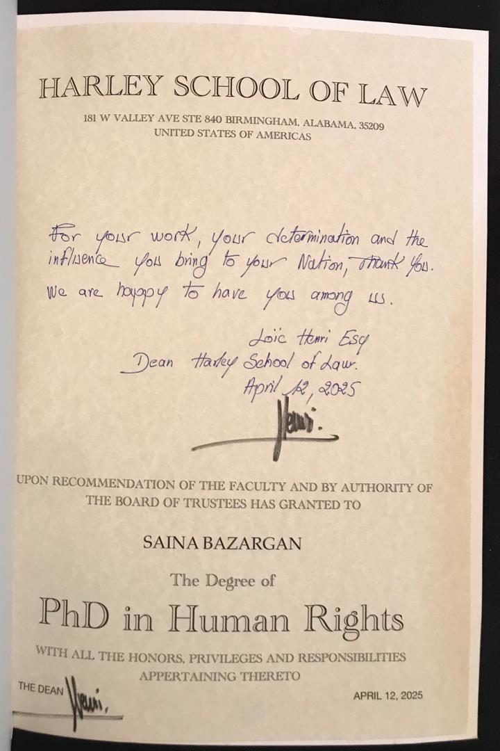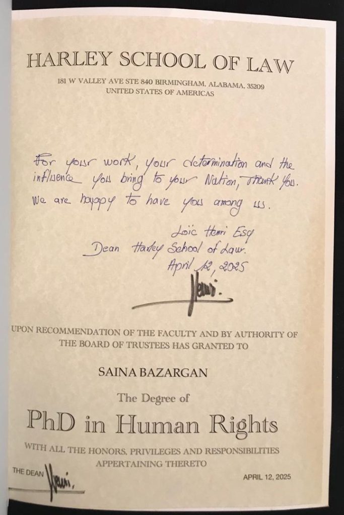 به گزارش نویدتهران، پروفسور هنری وکیل برجسته بین المللی و ریاست دانشگاه Harley law school دکتری افتخاری حقوق بشر را برای فعالیت های تحت عنوان «صلح» به خانم دکتر ساینا بازرگان ، مدیریت انستیتو مطالعات بین المللی صلح ،عضو رسمی کمیته ایرانی اتاق بازرگانی بین المللی Icc اهدا کرد.